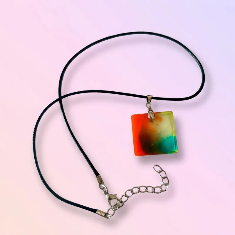 Laissez-vous transporter par un rêve de couleurs vibrantes qui dansent à la lumière. Ce pendentif carré capturer l'essence d'un coucher de soleil tropical, avec ses dégradés hypnotiques d'orange, de vert émeraude et de teintes terreuses. Portez un éclat unique qui illuminera votre style et révèlera votre personnalité audacieuse.