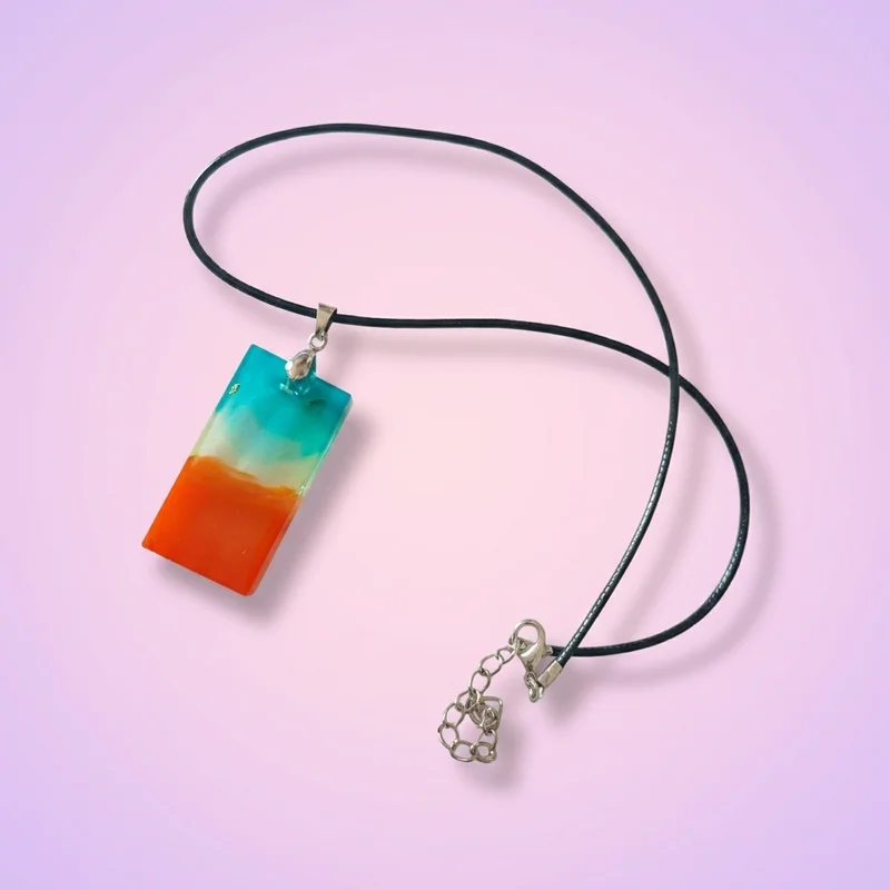 Emportez un éclat de vos vacances de rêve partout avec vous. Ce pendentif capture la beauté hypnotique d'un coucher de soleil sur l'océan, avec des dégradés de rouge flamboyant et de bleu turquoise lumineux. Une touche de luxe accessible qui illuminera votre style avec une touche de magie ensoleillée.